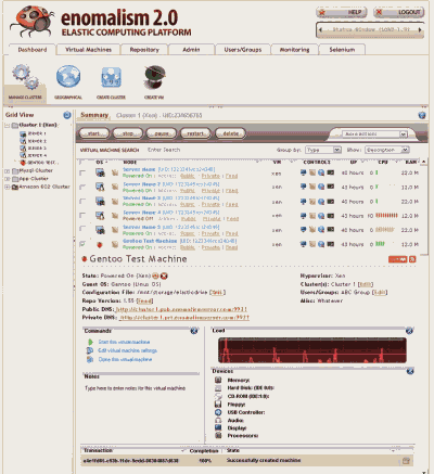 Enomalism è un’interfaccia grafica web-based per gestire un gruppo di server virtuali che adoperano diversi software di virtualizzazione. Attualmente Enomalism è in grado di portare a termine migrazioni da e per QEMU/KVM, Xen e Amazon EC2 (presto anche VMware, VirtualBox e OpenVZ).