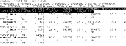 Xen, a differenza del kernel Linux per KVM, distribuisce le risorse del calcolatore in modo più omogeneo arrivando, in caso di elevato carico su tutte i tre domU, circa attorno al 60%. Il restante è attribuito al dom0.
