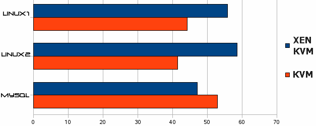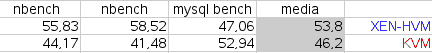 La virtual machine di KVM che esegue i benchmark di MySQL ottiene performance del 5% in rispetto a HVM mentre per le altre due (quelle che eseguono nbench) la situazione è contraria.