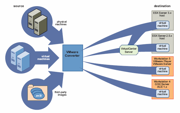 Il software permette non solo di trasformare macchine virtuali fatte con varie versioni di Vmware (Workstation, Esx Server, Gsx Server, Server 1.0.x, Virtual Center 2.x), ma anche di importare virtual machine di Virtual PC (dalla 7 in poi) e di Microsoft Virtual Server.